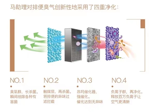 而馬助理馬桶空氣凈化器之所以受歡迎,在于其采用的是馬助理自主研發的專利技術“ONMA(昂瑪)催化技術”配以開創性的“源頭內吸法”,該技術能實時將剛一產生的排便臭氣瞬間內吸、一網打盡。其優勢在于改變以往等氣味擴散后才去凈化的處理辦法,而是直接在氣味產生的源頭,進行氣體收集,然后凈化。這樣不僅能避免先污染再治理的不足,而且凈化效果更好,更徹底,更安全。